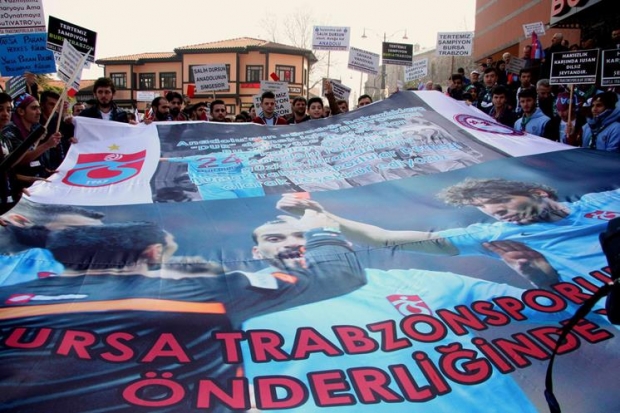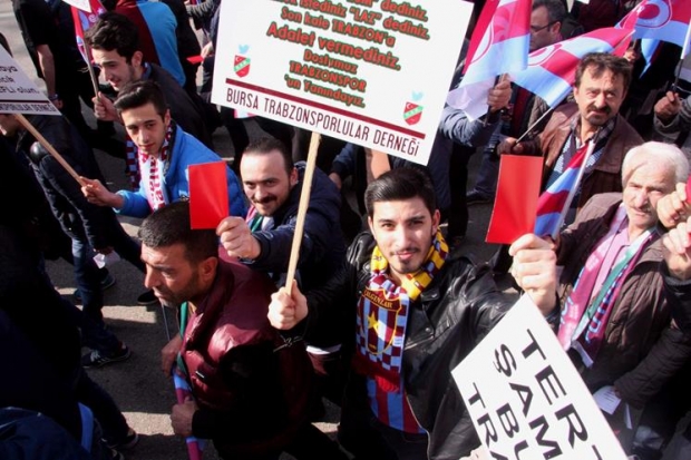 Bursa’da 20 Trabzonspor Derneği, 3 Bursaspor Derneği ve Bursa Trabzon Dernekleri Federasyonu, protesto yürüyüşü gerçekleştirdi. Yaklaşık bin taraftar, Zafer Plaza önünde toplanarak, birlikte horon tepti. Ellerindeki döviz ve kırmızı kartlarla Atatürk Anıtı’na yürüyüşe geçen grup, TFF’yi istifaya davet etti.