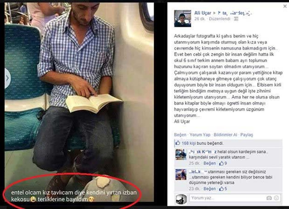 “Arkadaşlar fotoğraftaki şahıs benim ve hiç utanmıyorum karşımda oturmuş olan kıza veya çevremde hiç kimsenin namusuna bakmadığım için. Evet ben cebi çok zengin bir insan değilim hatta ilkokul 6. sınıf terkim annem babam ayrı toplumun huzurunu kaçıran soytarı olmadım utanıyorum… Çalmıyorum çalışarak kazanıyor param yettiğince kitap almaya kütüphaneye gitmeye çalışıyorum çok utanç duyuyorum böyle bir insan olduğum için… Elbisem kirli terliğim bindiğim metroya uygun değil işte zihnimi kirletemiyorum utanıyorum… Ama her ne olursa olsun bana kitaplar böyle olmayı öğretti insan olmayı, hayvanlaşıp çevremi kirletemiyorum üzgünüm utanıyorum…” ifadelerine yer verdi.