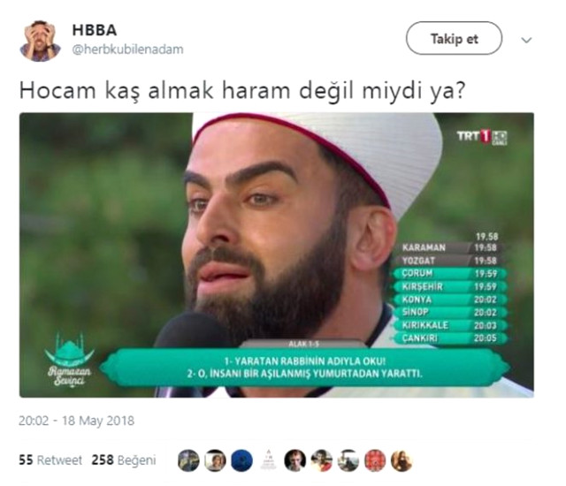 TRT 1 ekranlarında yayınlanan Ramazan Sevinci programında Kur’an-ı Kerim okuyan Mustafa Özyılmaz’ın kaşları sosyal medyada olay oldu.