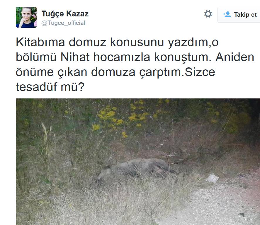 Arabayla domuza çarpan ve öldüren Tuğçe Kazaz, daha sonra bu görüntüyü Twitterhesabından paylaştı. Kazaz, ‘Kitabıma domuz konusunu yazdım, o bölümü Nihat Hocamızla konuştum, aniden önüme çıkan domuza çarptım, sizce tesadüf mü?’ notuyla fotoğrafı paylaştı.