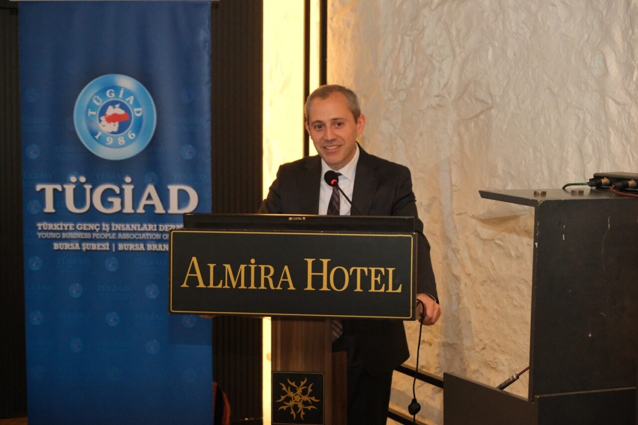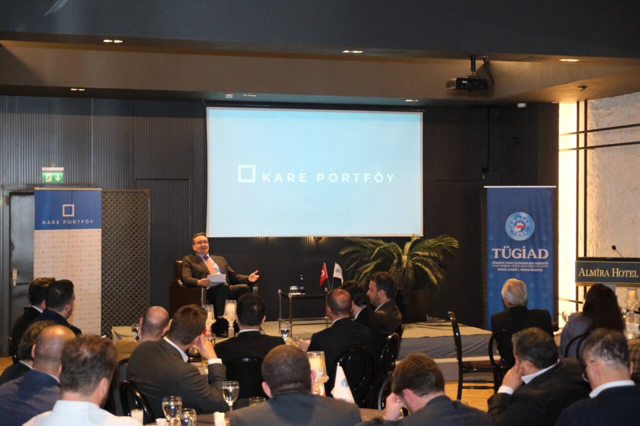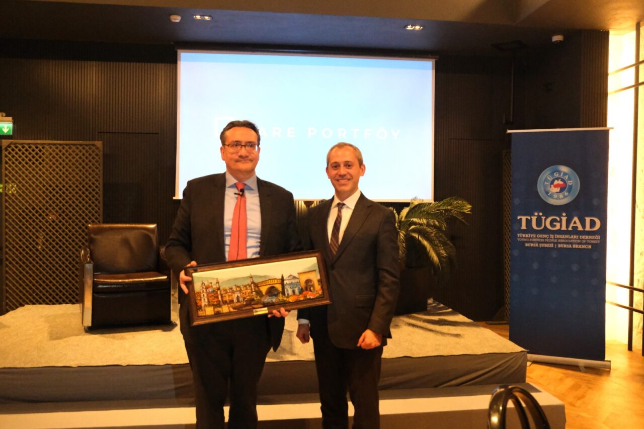 Türkiye Genç İş İnsanları Derneği (TÜGİAD) Bursa Şubesi “Bursa Buluşmaları” etkinliklerine bir yenisini daha ekledi. Kare Portföy Yönetimi Genel Müdürü Ümit Kumcuoğlu’nun konuk olarak katıldığı gecede, “Yeni Dönemde Ekonomi: Riskler, Fırsatlar ve Stratejiler” konuları ele alındı. Küresel ve yerel ekonomik gelişmelerin iş dünyası üzerindeki etkilerine değinen Kumcuoğlu, katılımcılara hem mevcut riskleri analiz etme hem de önümüzdeki döneme dair stratejik adımlar belirleme konusunda değerli bilgiler sundu. Enflasyon, faiz politikaları, yatırım trendleri ve sektör bazlı öngörüler gibi pek çok başlıkta görüşlerini paylaşan Kumcuoğlu, özellikle iş insanlarının finansal esneklik ve adaptasyon becerilerini güçlendirmesi gerektiğine dikkat çekti.