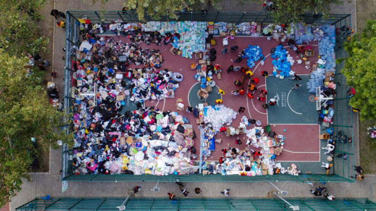 Burada düzenlenen ve ayrılan yardım malzemeleri ihtiyaç sahiplerine ulaştırılıyor. Çadırda kalan vatandaşlar için battaniye, yastık gibi ihtiyaçlardan giyime kadar birçok çeşitli yardım malzemesi bulunuyor. Emrah Apartmanı’nın yakınında bulunan bir basketbol sahasında ise gelen yardım malzemelerinin alanı doldurması havadan görüntülendi. Görüntülerde sahanın içerisinin tamamen yardım malzemeleri ile dolu olduğu ve görevlilerin içeride düzenleme yaptığı görüldü.