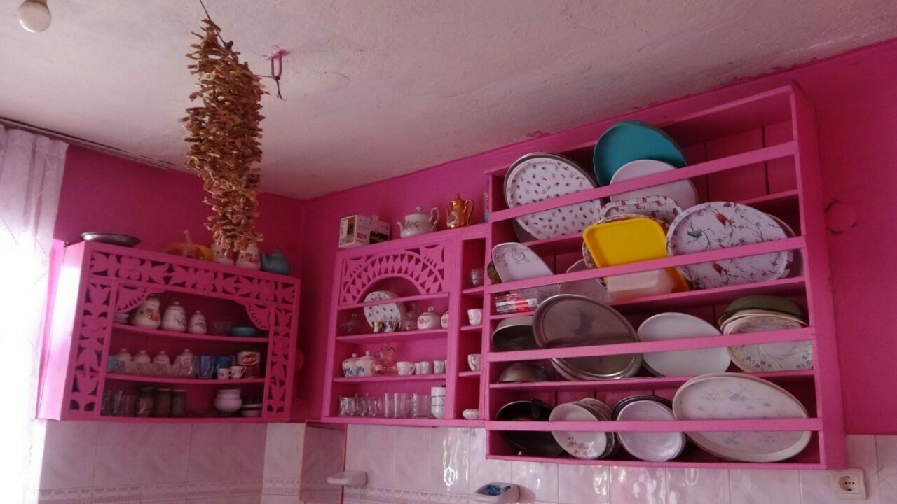 Yaşadığı evin her detayını pembeye boyayan Sakine teyze, pembe eviyle dikkat çekiyor. Tek katlı evinin dış kapısından duvarlarına, evin içerisinde bulunan süs eşyalarına kadar pembeye boyayan Akkul, pembe aşkının küçük yaşlarda başladığını söyledi.