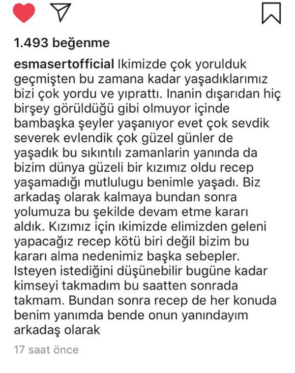 “İkimiz de çok yorulduk. Geçmişten bu zamana kadar yaşadıklarımız bizi çok yordu ve yıprattı. İnanın dışarıdan hiçbir şey göründüğü gibi olmuyor. İçinde bambaşka şeyler yaşanıyor. Evet çok sevdik, çok severek evlendik. Çok güzel günler yaşadık. Bu sıkıntılı zamanların yanında da bizim dünya güzeli bir kızımız oldu. Recep yaşamadığı mutluluğu benimle yaşadı. Biz arkadaş olarak kalma, bundan sonra yolumuza bu şekilde devam etme kararı aldık. Kızımız için ikimiz de elimizden geleni yapacağız. Recep kötü biri değil, bizim bu kararı alma nedenimiz başka sebepler. İsteyen istediğini düşünebilir. Bugüne kadar kimseyi takmadım, bu saatten sonra da takmam. Bundan sonra Recep de her konuda benim yanımda bende onun yanındayım, arkadaş olarak.”