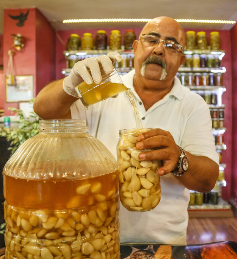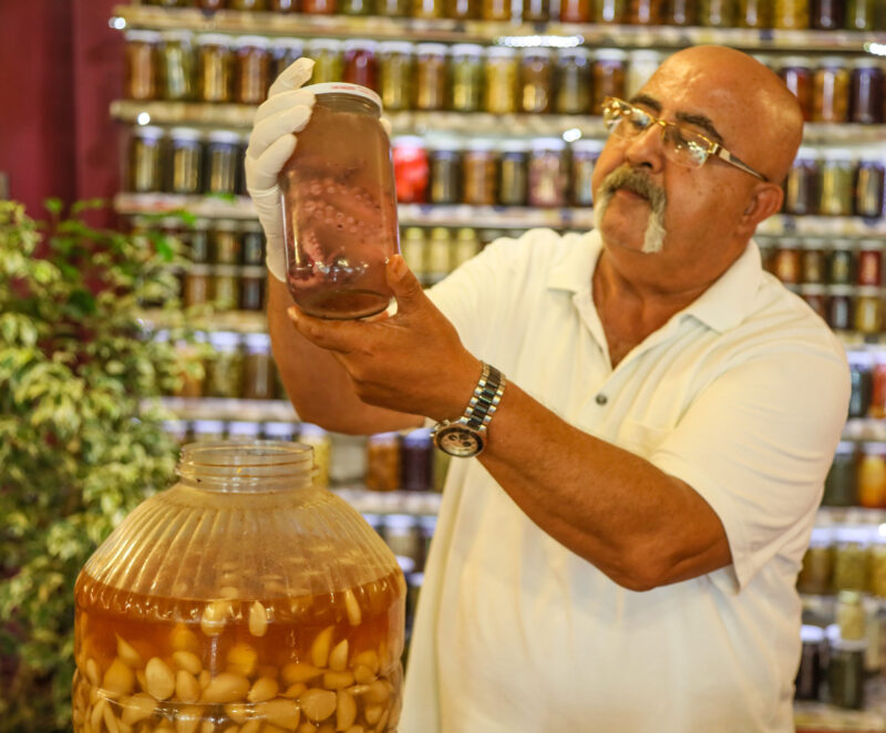 Hemen hemen tüm meyvelerin yanı sıra, çam kozalağı, çıra, bıldırcın ve tavuk yumurtası, hamsi, yer elması, şeker pancarı, biber, ejder meyvesi, ceviz, fındık ve ahtapottan da turşu kuran Hazar, restoranının vitrinlerini turşularıyla doldurdu.