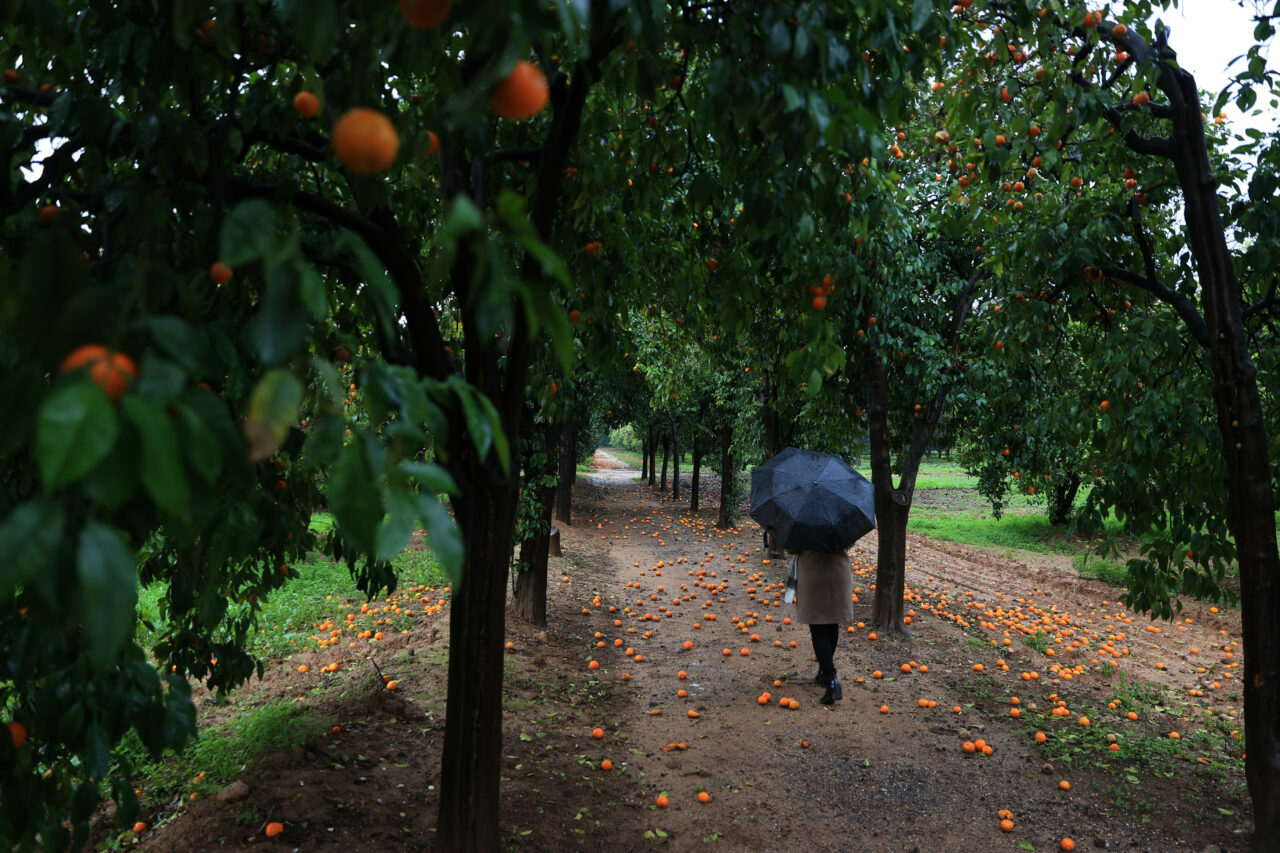 Meteoroloji Genel Müdürlüğünün “Turuncu” kod uyarısında bulunduğu Antalya’da kuvvetli yağış ve fırtınanın etkisiyle ağaçlardaki turunçlar yerlere döküldü.