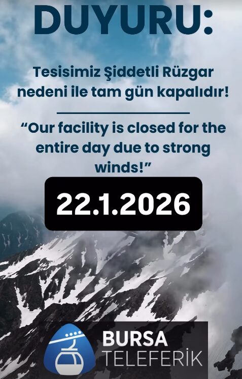 Bursa Teleferik’ten yapılan açıklamada, olumsuz hava koşullarının yolcu güvenliği açısından risk oluşturduğu belirtilerek, teleferik seferlerinin tam gün süreyle durdurulduğu ifade edildi.