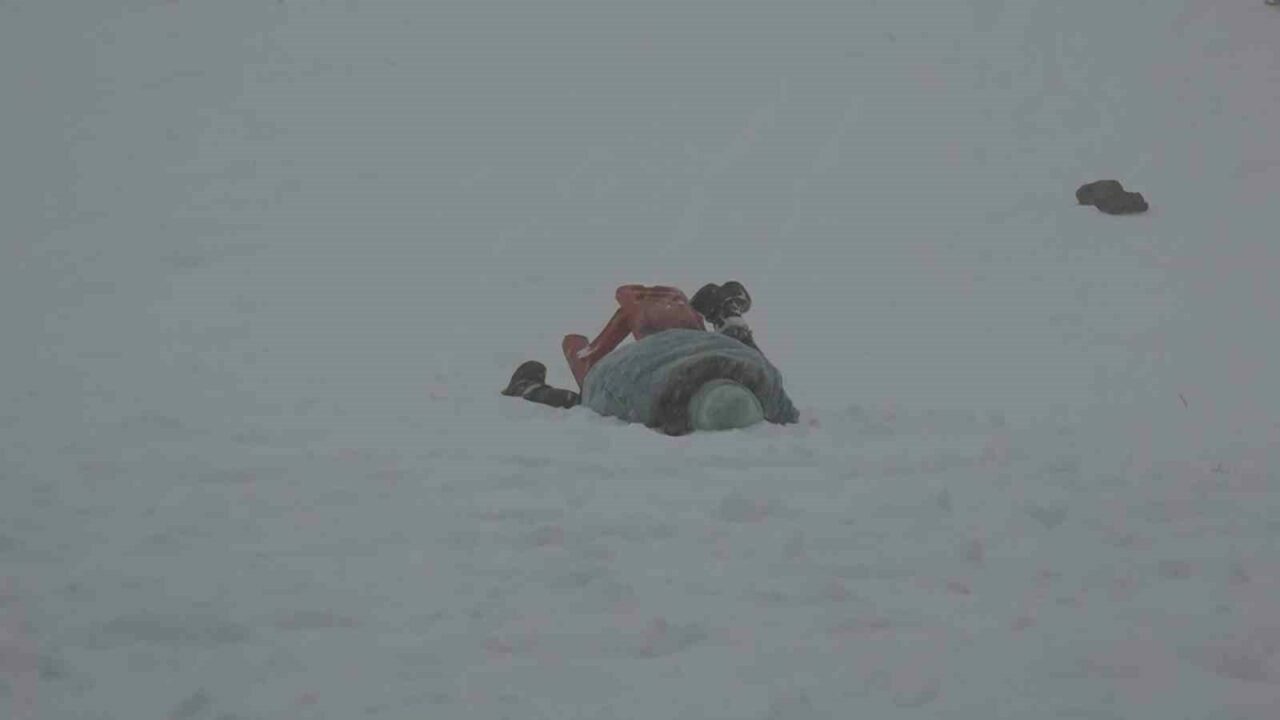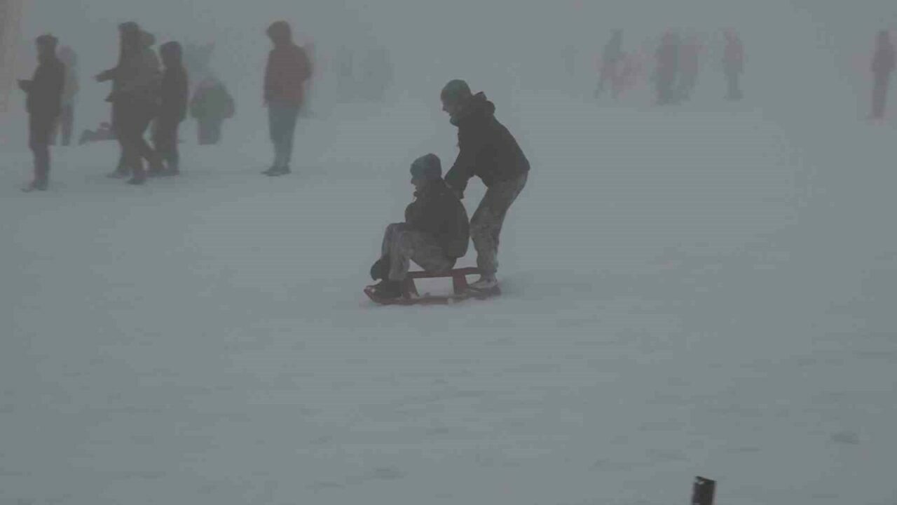 Kiralık kızaklarla doyasıya eğlenen vatandaşlar, düşe kalka karın keyfini çıkardı. Bir kadının yüzü koyun yere kapaklandığı anlar ise kameralara yansıdı.