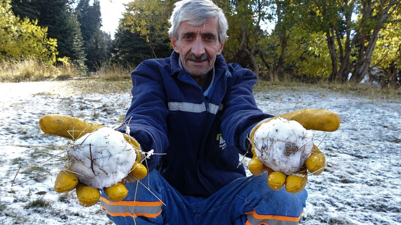Bir haftadır Uludağ’da çalıştıklarını ifade eden işçiler, ‘Sabah güne karla uyandık. Çok güzel manzara, mevsimin ilk karı yağdı, biz de kar topu oynayarak keyfinin çıkarıyoruz’ dedi.