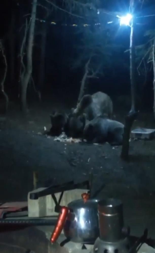 Bir kampçı tarafından görüntülenen ayılar, kaptan su içiyor ve iştahla yemekleri yiyor.