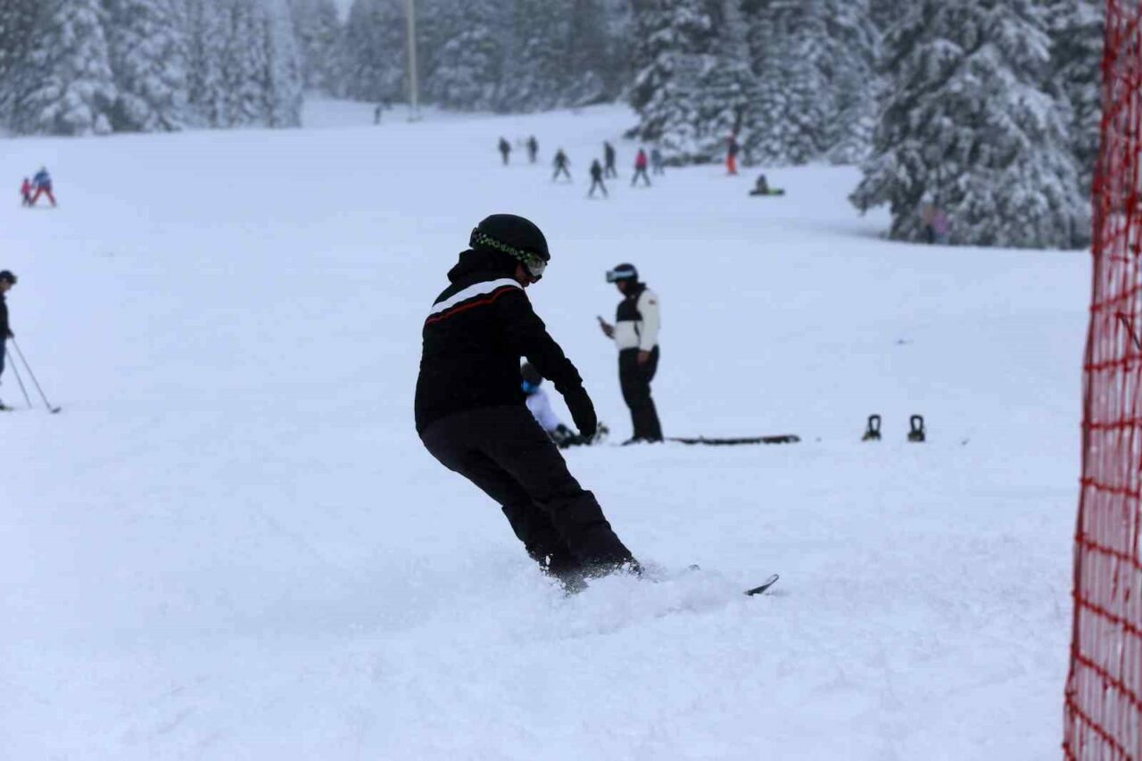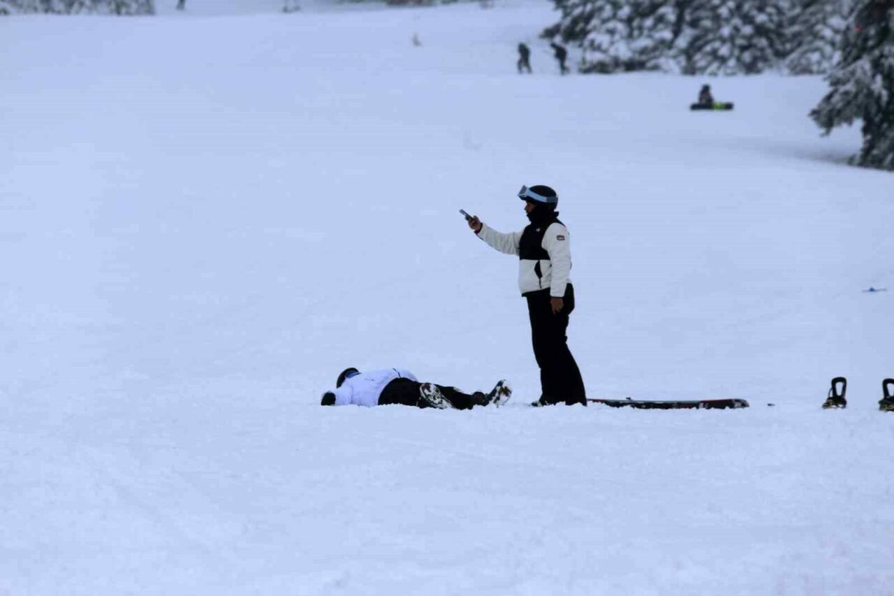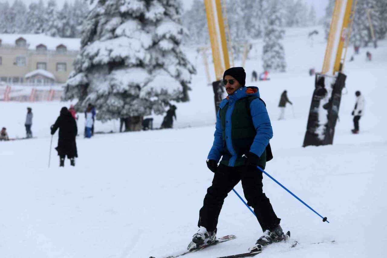 Hafta sonunu değerlendiren yerli ve yabancı turistler pistlere akın ederken, ilk kez kayak yapan acemi kayakçılar düşe kalka kayak keyfi yaşadı.