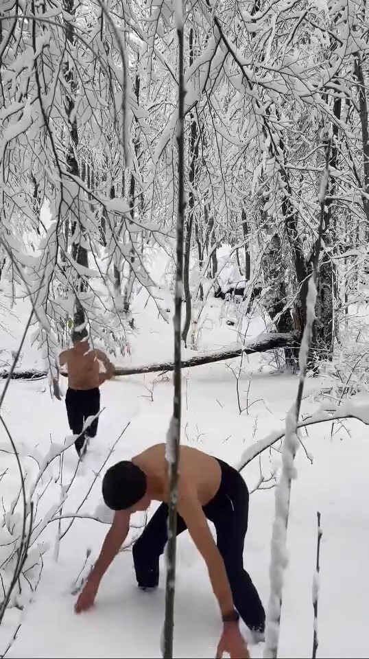 İki kafadar yarı çıplak şekilde kara gömülürken, koşarak da spor yaptı.