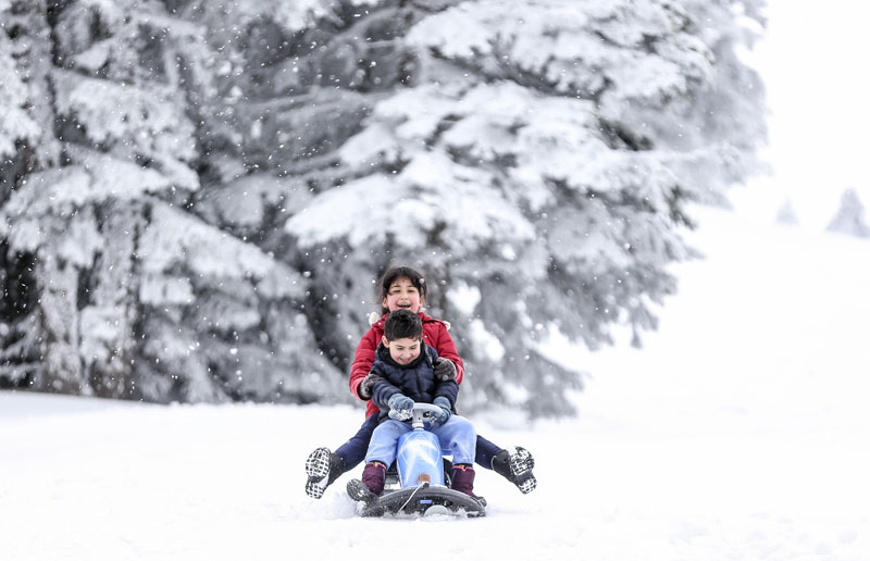 Bunu fırsat bilen tatilciler, çam ağaçlarıyla kaplı ormanlık alanda kayak yaptı, kızakla kaydı.