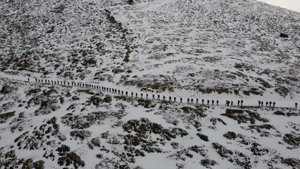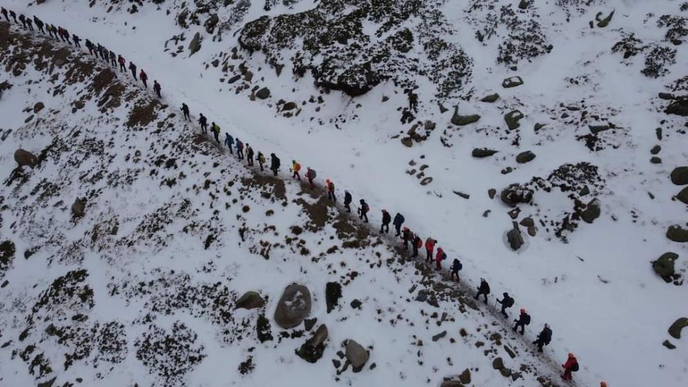 İstanbul, Muğla, Sivas, Ankara, Rize, Erzurum, Kırıkkale ve Bursa’dan 124 dağcı Beden Terbiyesi tesisleri önünden tırmanışa geçti. Eski cip yolu ve Kapı rotasını izleyen dağcılar zorlu hava şartlarının etkisini gittikçe arttırmasına rağmen tırmanışlarını sürdürdüler. Rasat düzü mevkiine çıkmak için Kapı rotasından sırta ulaşıldığında, hareket edilmesini engelleyen fırtınaya maruz kalındığı için dönüşe karar verildi. Bu sırada buzda kayan bir dağcı sürüklenmeye başladığı sırada diğer dağcılar tarafından kurtarıldı. O anlar bir başka dağcı tarafından cep telefonu ile kaydedildi. Tüm bu heyecan ve adrenalin dolu dakikalar yaşansa da 124 dağcının drone ile havadan görüntülenen tek sıra halindeki zirve yürüyüşü kartpostalları aratmadı.