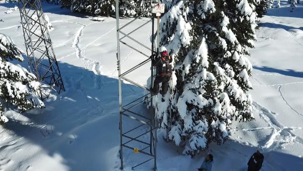 Ekipler, araçların giremediği yerlerde bulunan arızalı direklere, 70 santimetrelik kar kalınlığında zorlukla yürüyerek, ulaşıyor. Hava sıcaklığının sıfırın altında 10 dereceye kadar düştüğü Uludağ’da ekipler, 20 metrelik elektrik direklerine tırmanıyor. Ekiplerin zorlu hava şartlarındaki çalışmaları ise dronla havadan görüntülendi.