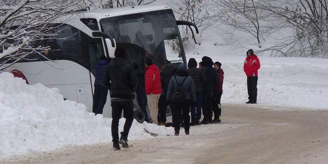 Öğrencileri taşıyan otobüs Uludağ’a 10 kilometre kala sürücünün zincir takmaması sonucu kara saplandı.