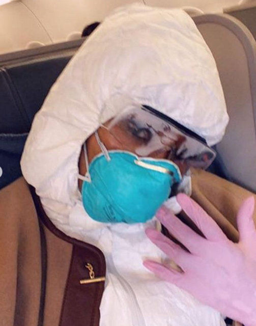 Ünlü manken giydiği tulum, eldiven ve taktığı maskeyle virüsü ne kadar ciddiye aldığını gösterdi.