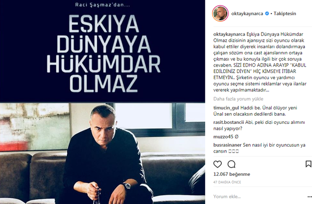 Oyuncu Oktay Kaynarca, sosyal medya hesabından başrolünde oynadığı ‘Eşkıya Dünyaya Hükümdar Olmaz’ adlı dizinin adını kullanarak insanları dolandıran bir şebeke konusunda uyarıda bulundu.