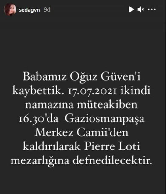 “Babamız Oğuz Güven’i kaybettik. 17.07.2021 ikindi namazına müteakıben 16.30’da Gaziosmanpaşa Merkez Camii’nden kaldırılarak Pierre Loti Mezarlığı’na defnedilecektir.”