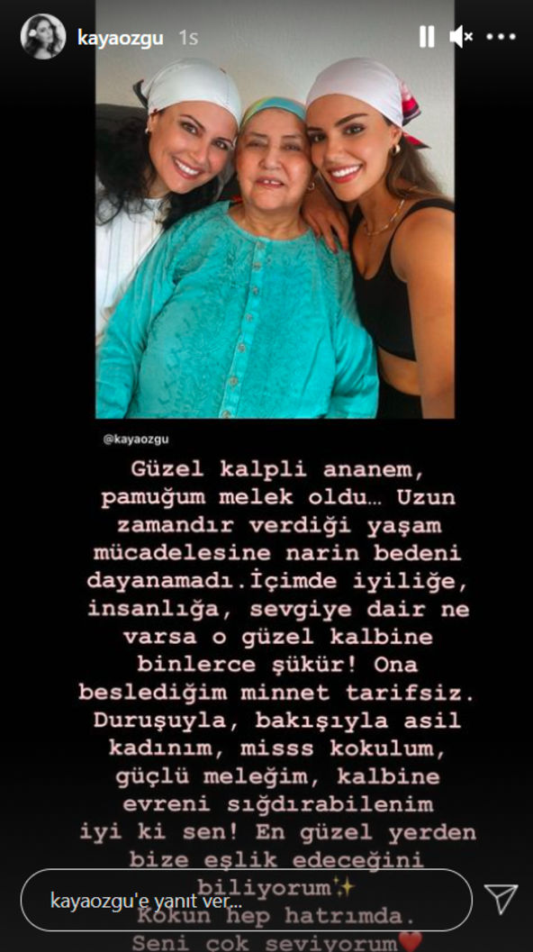 Özgü Kaya, gönderisinde, “Güzel kalpli anneannem, pamuğum melek oldu… Uzun zamandır verdiği yaşam mücadelesine narin bedeni dayanamadı. İçimde iyiliğe, insanlığa, sevgiye dair ne varsa o güzel kalbine binlerce şükür! Ona beslediğim minnet tarifsiz… Duruşuyla, bakışıyla asil kadınım, mis kokulum, güçlü meleğim, kalbine evreni sığdırabilenim… İyi ki sen! En güzel yerde bize eşlik edeceğini biliyorum. Kokun hep hatırımda, seni çok seviyorum.” ifadelerine yer verdi.