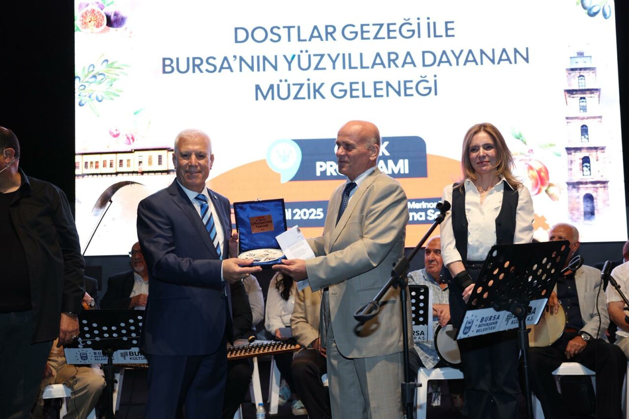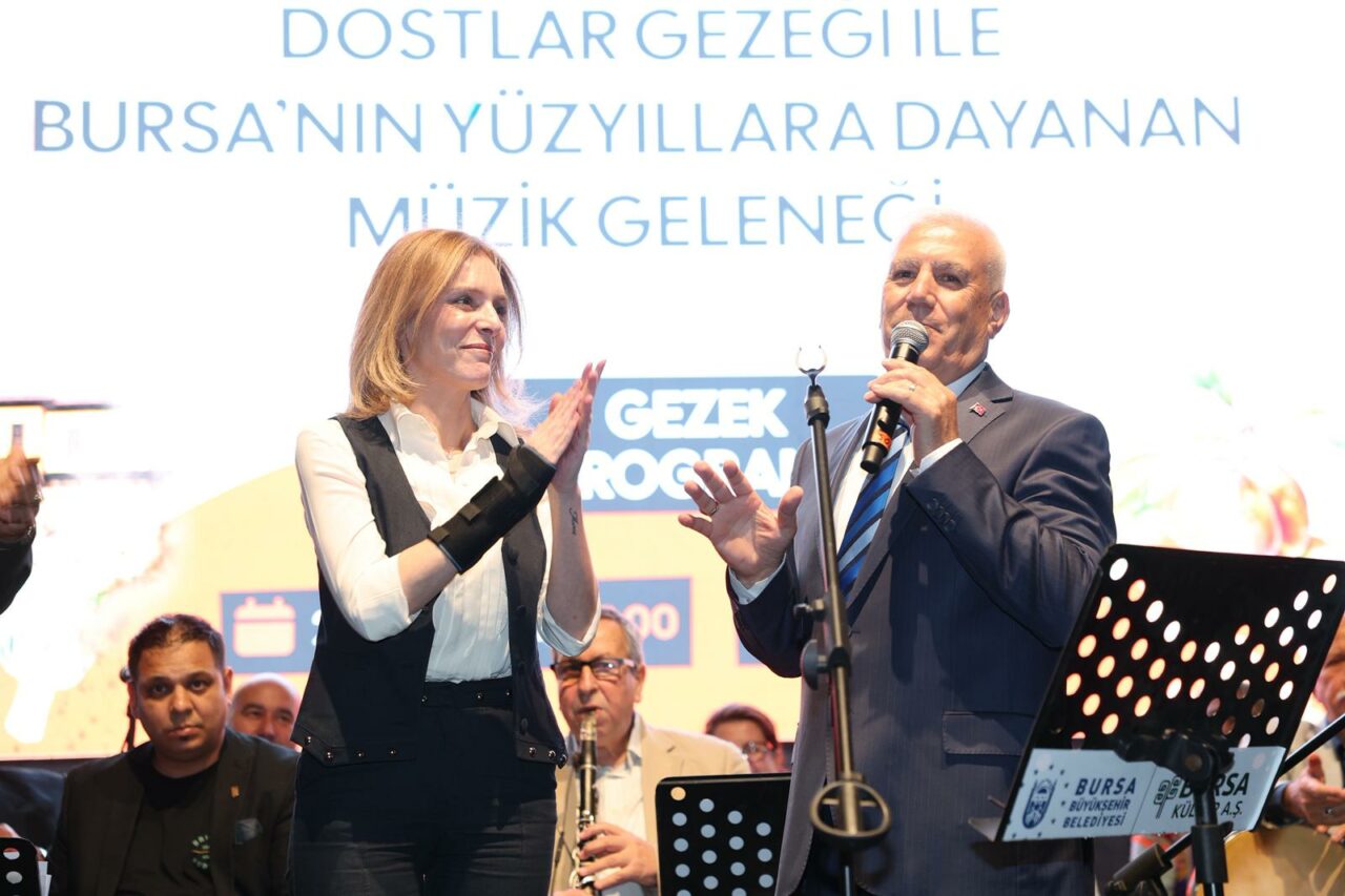 Bursa’nın yaşam kültürünü yansıtan Gezek Programı da alanı dolduranlar tarafından büyük ilgiyle takip edildi. Başkan Mustafa Bozbey de eşi Seden Bozbey ile birlikte programa katılarak Bursa’nın yüzyıllara dayanan zengin müzik geleneğini doyasıya yaşadı. Davet üzerine sahneye çıkan Başkan Bozbey, ‘Yeşil Ördek Gibi Daldım Göllere’ türküsünü seslendirdi. Daha sonra Şef Dr. Aysel Gürel önderliğinde sahne alan ‘Gastro Müzik Korosu’ da performanslarıyla Bursalılara keyifli anlar yaşattı.