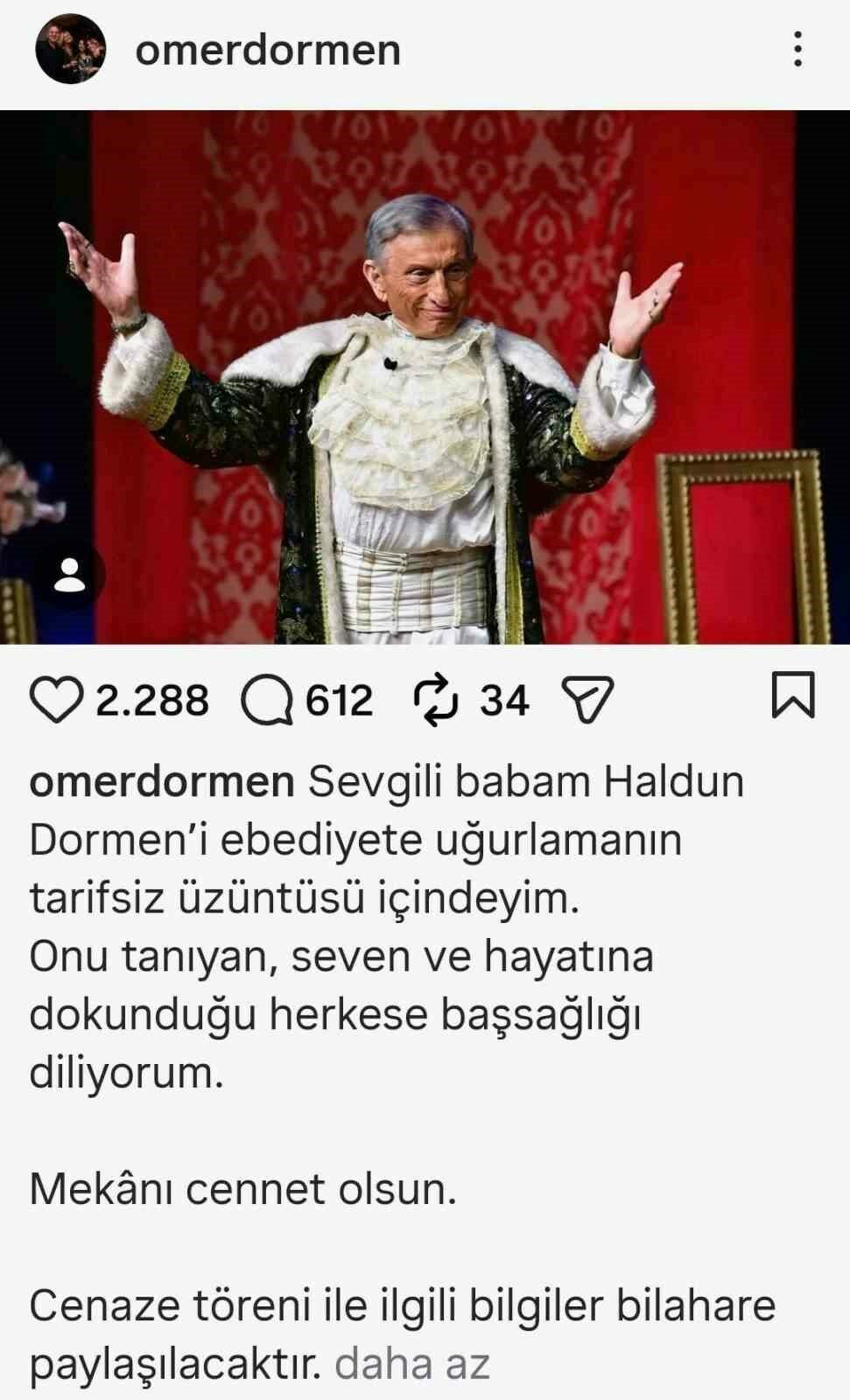 Haldun Dormen’nin oğlu Ömer Dormen, sosyal medyadan yaptığı paylaşımda, “Sevgili babam Haldun Dormen’i ebediyete uğurlamanın tarifsiz üzüntüsü içindeyim. Onu tanıyan, seven ve hayatına dokunduğu herkese başsağlığı diliyorum. Mekanı cennet olsun” ifadelerini kullandı.