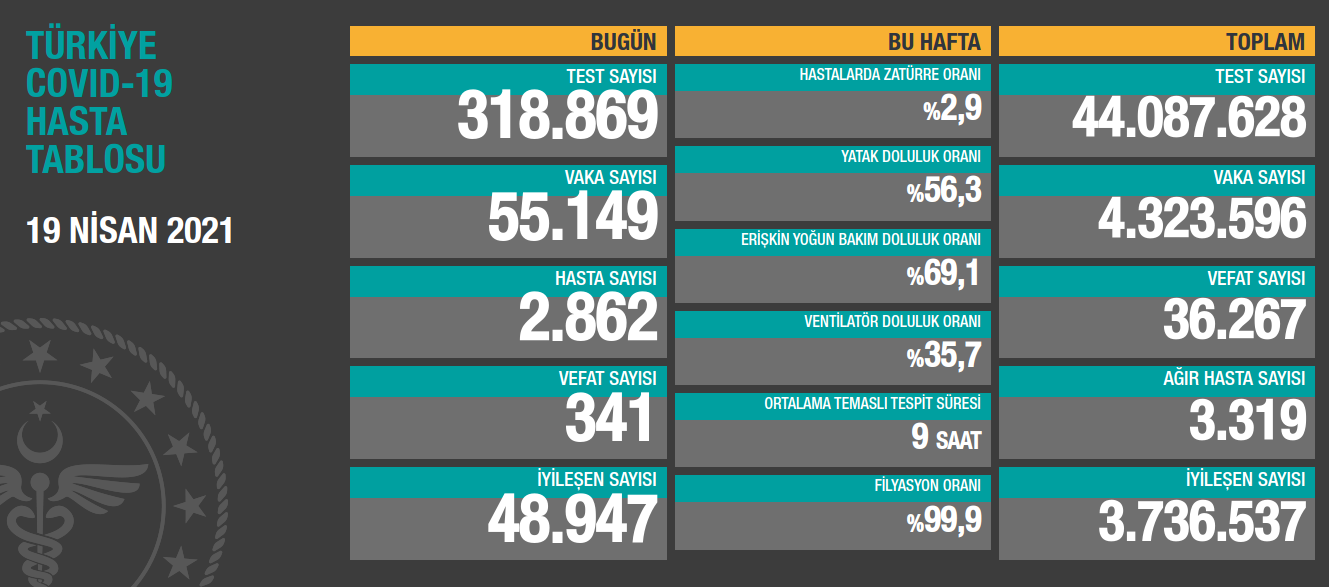 Ağır hasta 3 bin 319 oldu, 48 bin 947 kişinin Kovid-19 tedavisinin/karantinasının sona ermesiyle iyileşen sayısı 3 milyon 736 bin 537’ye yükseldi.