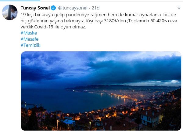 Vali Sonel paylaşımında, “19 kişi bir araya gelip pandemiye rağmen hem de kumar oynarsa biz de hiç gözlerinin yaşına bakmayız. Covid-19 ile oyun olmaz” ifadelerine yer verdi.