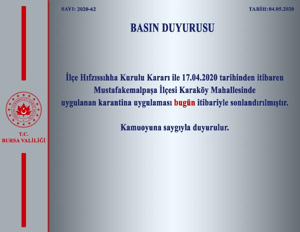 Bursa Valiliğinden yapılan açıklamada, yeni tip koronavirüs (Kovid-19) tedbirleri kapsamında Karaköy Mahallesi’nin 17 Nisan’da karantinaya alındığı hatırlatıldı.