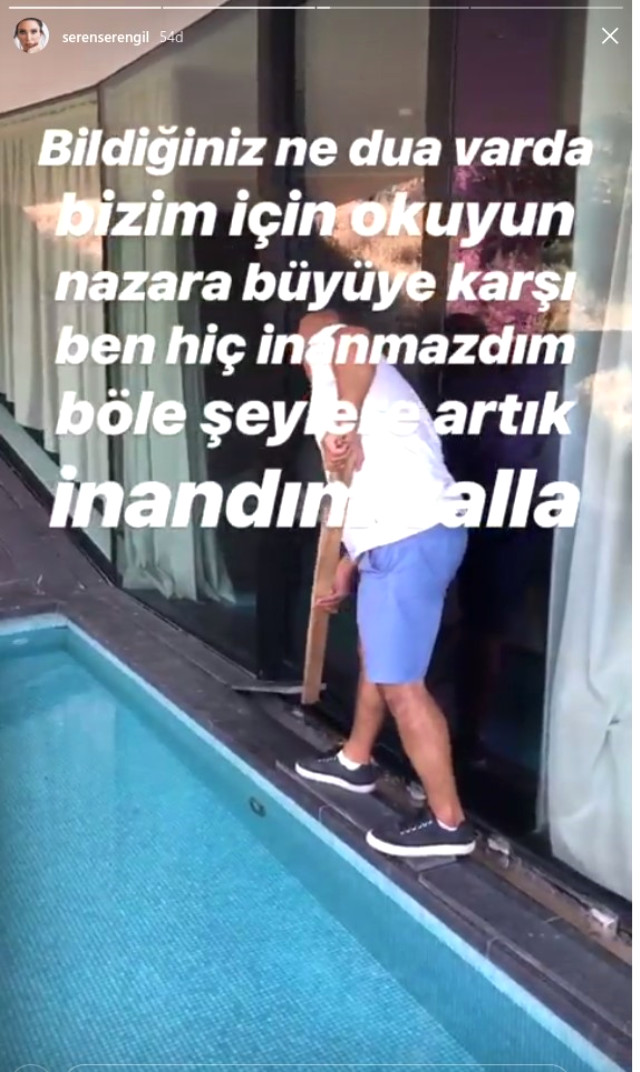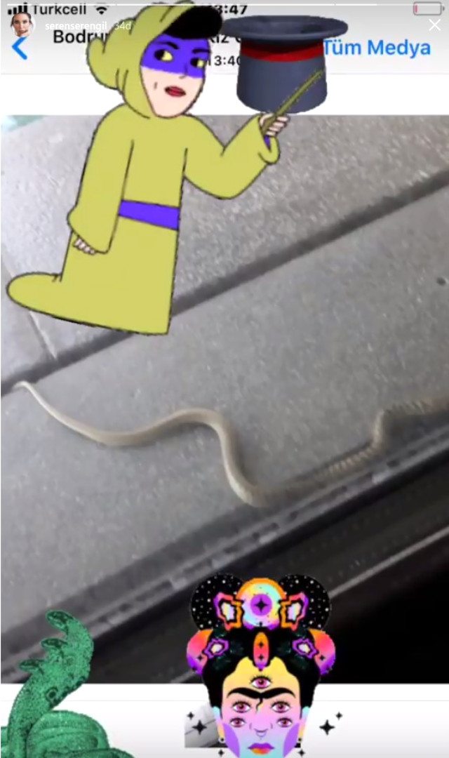 Seren Serengil, villasında yılan arama çalışmasını instagram hesabından, Nazara inanmazdım ama artık inanıyorum” notuyla paylaşım yaptı. Yılanın bulunmasıyla rahat nefes alan Seren Serengil, bulunan yılanı da paylaşmayı ihmal etmedi. Serengil, sevenlerinden dua da istedi.