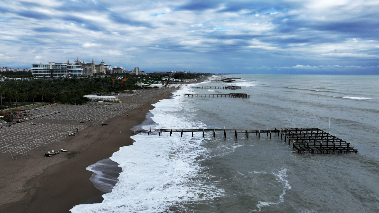 Bir tarafta denizde yüksek dalgalar, diğer tarafta gökyüzünü çevreleyen bulutlar drone ile görüntülendi.
