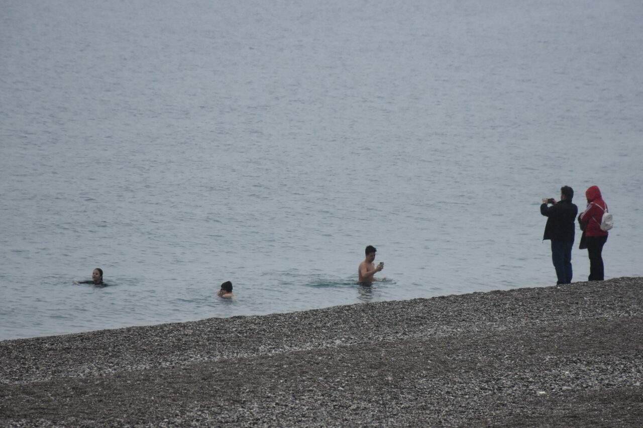 Bazı kent sakinleri ve turistler, yağışlı havaya rağmen Konyaaltı Sahili’nde vakit geçirdi.