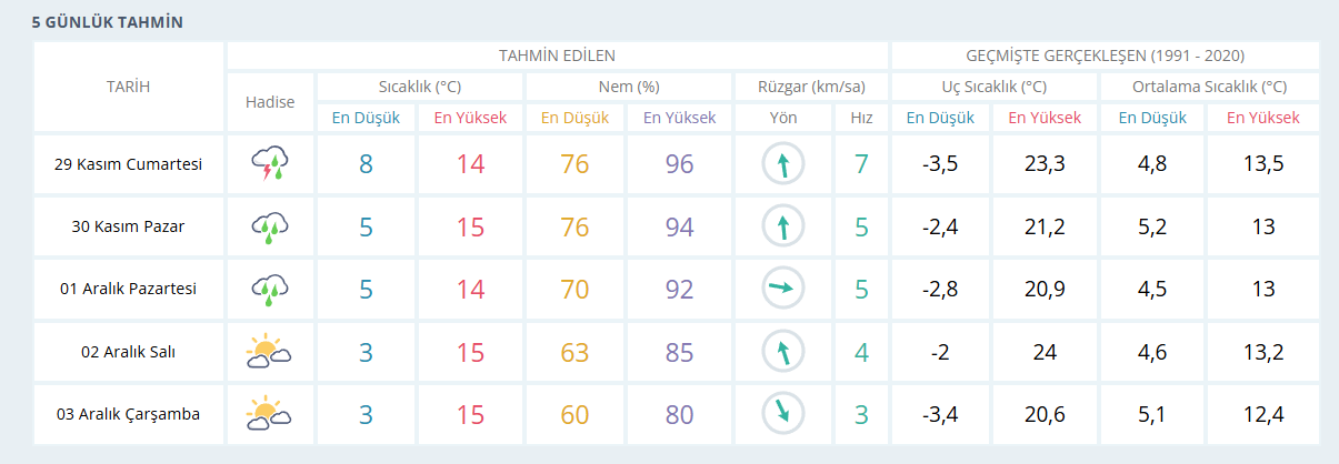 1 Aralık Pazartesi: 5°C / 14°C -Yağmurlu