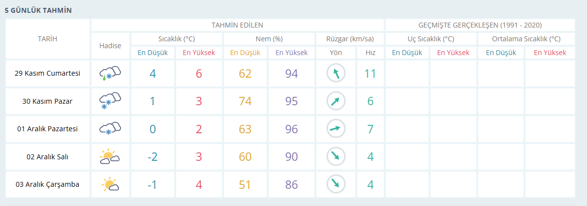 30 Kasım Pazar: -1°C / 3°C -Kar