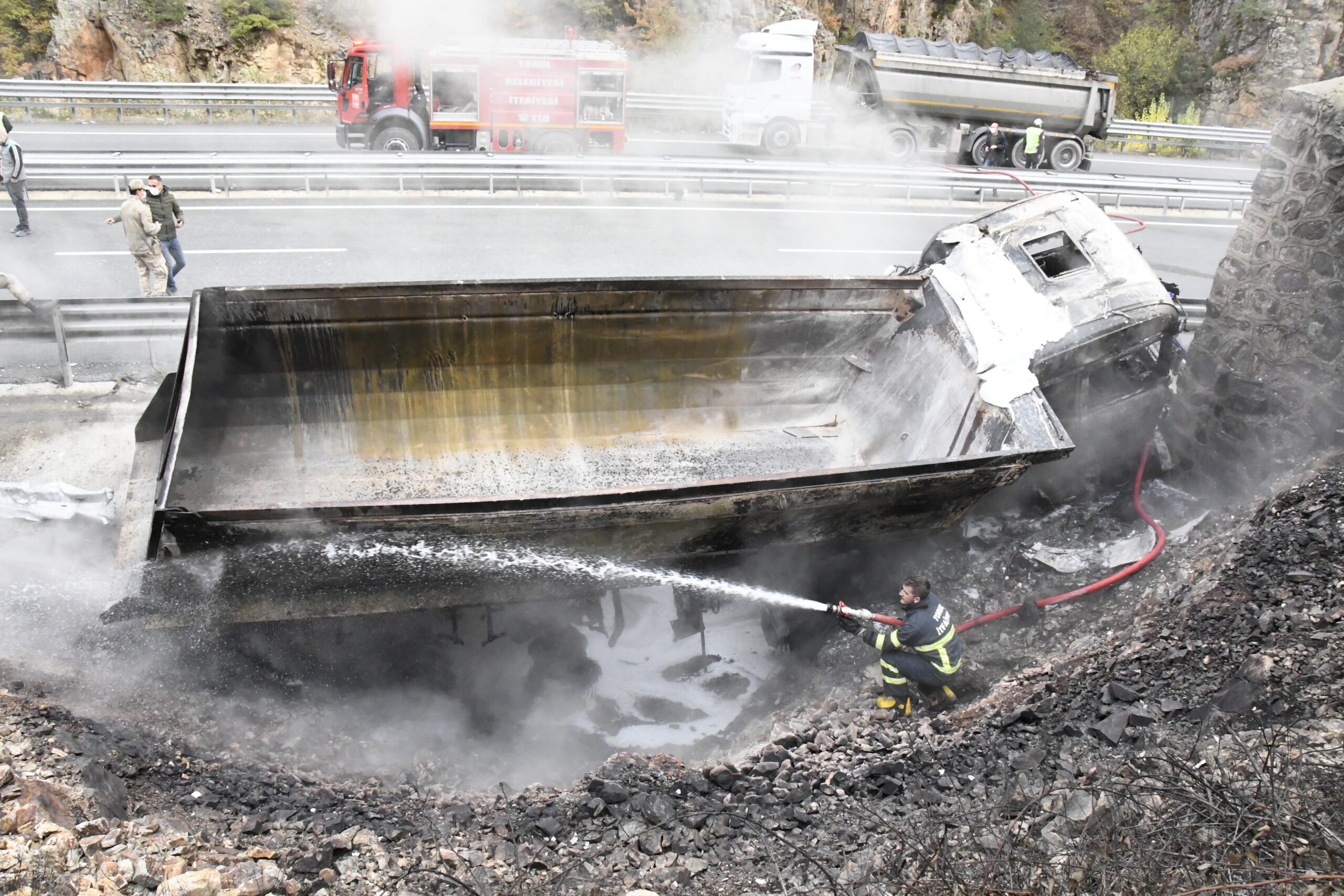 TIR’ın kullanılamaz hale geldiği yangın, itfaiye ekiplerinin müdahalesiyle söndürüldü.