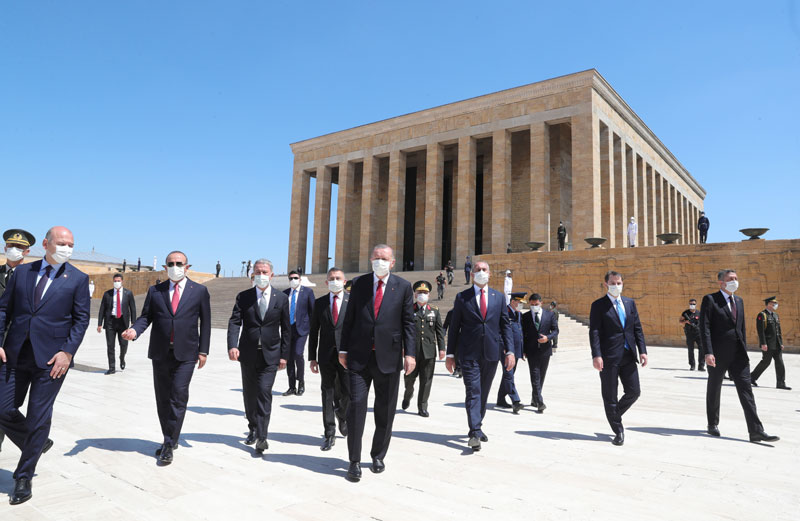 Cumhurbaşkanı Erdoğan’ın Aslanlı Yol’un başındaki yerini almasının ardından başlayan törende, Cumhurbaşkanı Yardımcısı Fuat Oktay, Adalet Bakanı Abdulhamit Gül, Dışişleri Bakanı Mevlüt Çavuşoğlu, Hazine ve Maliye Bakanı Berat Albayrak, İçişleri Bakanı Süleyman Soylu, Milli Eğitim Bakanı Ziya Selçuk, Milli Savunma Bakanı Hulusi Akar, Genelkurmay Başkanı Orgeneral Yaşar Güler, Kara Kuvvetleri Komutanı Orgeneral Ümit Dündar, Deniz Kuvvetleri Komutanı Oramiral Adnan Özbal ve Hava Kuvvetleri Komutanı Orgeneral Hasan Küçükakyüz de Aslanlı Yol’dan geçerek, mozoleye çıktı.