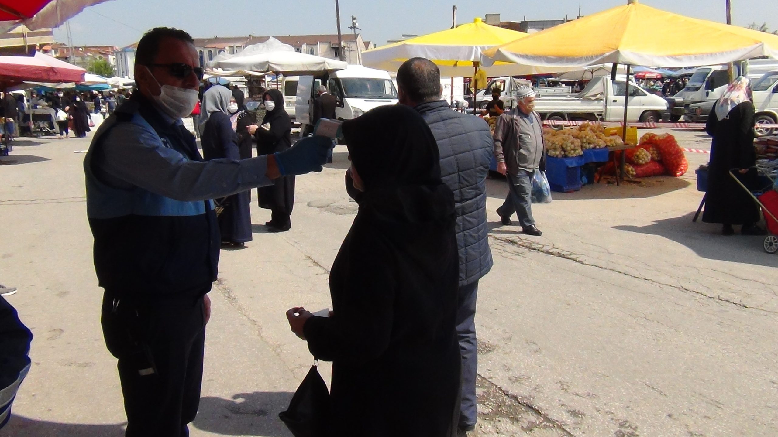 Pazara gelenler önce dezenfekte tünelinden geçtiler, ardından pazara alındılar. Maskesi olmayanlara ise zabıta ekipleri tarafından maske verildi. Pazar günü açılan pazar günü ise salı gününe alındı.