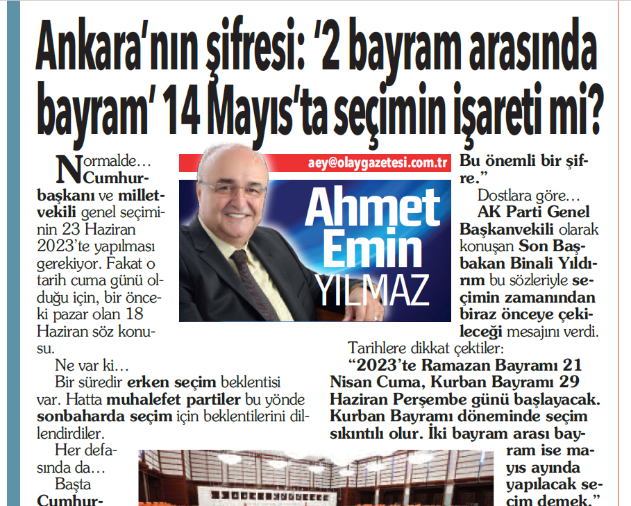 18 Temmuz 2022 günü… “Ankara’nın şifresi: ‘2 bayram arasında bayram’ 14 Mayıs’ta seçimin işareti mi?” başlıklı yazımızda Ankara kulislerini aktardığımızda gündemde böyle bir konu yoktu.