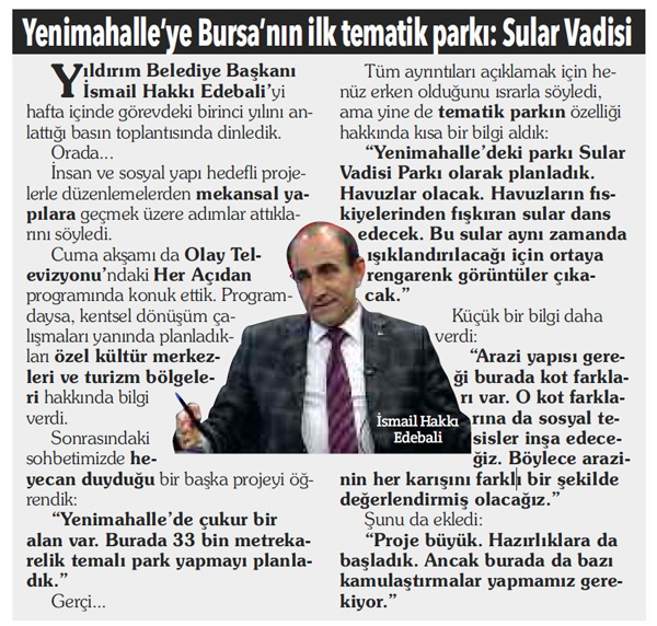 Arşivimizi açıp baktık… 3 Nisan 2015 günü Olay Televizyonu’nda konuk ettiğimiz Yıldırım Belediye Başkanı İsmail Hakkı Edebali ilk kez Sular Vadisi projesini açıklamış, biz de 5 Nisan 2015 günü bu sütunlarda yazmışız.