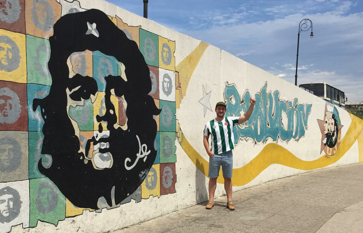 Bursaspor formalı Avukat Mustafa Şenyurt, sokaklarında dolaştığı Havana’da dünyadaki sol gençliğin idolü olan Che Guevara’nın duvar posteri önünde poz verirken, ortama uygun olarak sol yumruğu da sergiliyor.