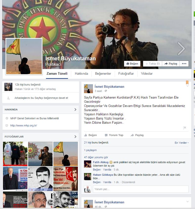 MHP Genel Sekreteri ve Bursa Milletvekili İsmet Büyükataman’ın sosyal medya Facebook’ta 12 bin 930 takipçisi olan beğeni sayfasını dün sabah kendilerini PKK Hack Team olarak tanıtan korsanlar ele geçirdiler.