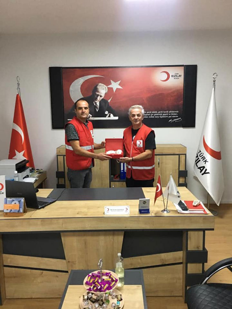 Bursalı ünlü tiyatro sanatçısı Zafer Algöz de ziyaret ettiği Kızılay Mudanya Şube Başkanı Mustafa Bayrak’la birlikte kırmızı yelek giydi ve iyilik hareketine katıldı.