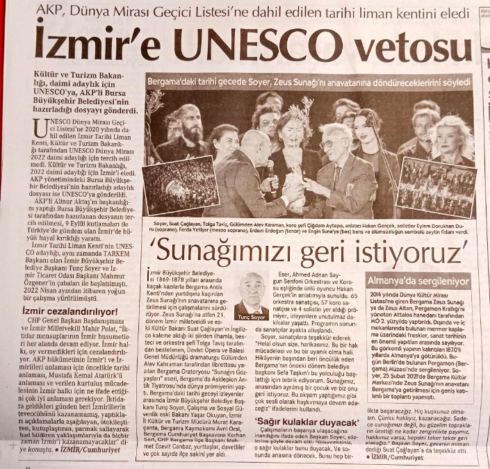 “AKP, Dünya Mirası Geçici Listesi’ne dahil edilen tarihi liman kentini eledi” denilen haber “İzmir’e UNESCO vetosu” başlığı taşıyor.