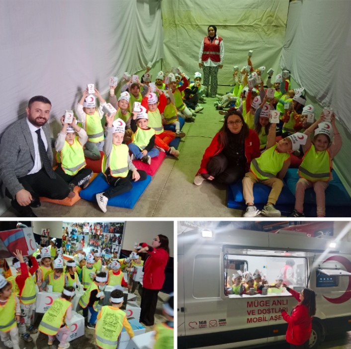Her gün 25 anaokulu ve ilkokulun öğrencilerinin ağırlandığı müze gibi sergide küçük çocuklar Kızılay’ı tanırken afet bilinci ediniyorlar.
