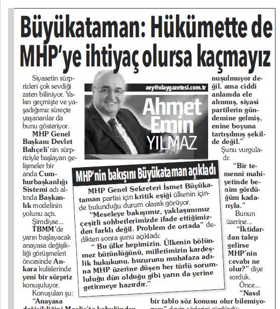 Arşivimizi açıp baktık… MHP’li milli mutabakat hükümeti konusu ilk gündeme geldiğinde, MHP Genel Sekreteri İsmet Büyükataman’a sormuş, cevabını da 8 Ocak 2017 günü bu sütunlardan aktarmıştık.