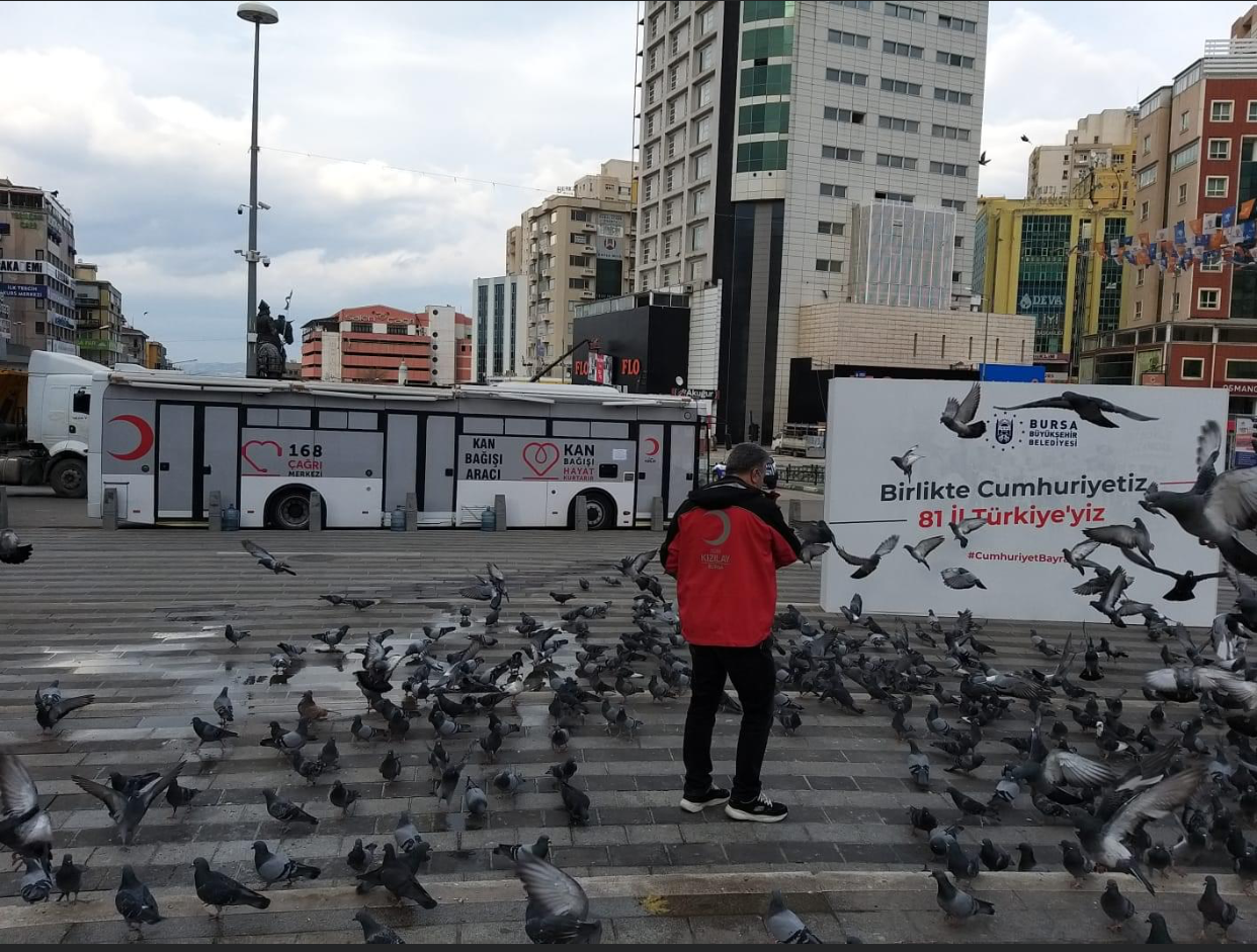 Cadde ve sokakların boşaldığı için aç kalan kuşlar da unutulmadı, Kızılay ekipleri kuşlara da yem attı.