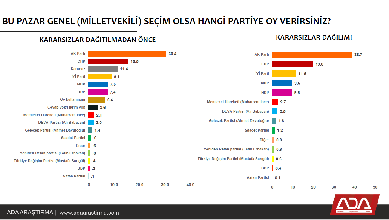 AK Parti yüzde 38.7, CHP yüzde 19.8, İYİ Parti yüzde 11.5, MHP yüzde 9.6, HDP yüzde 9.5, Memleket Hareketi yüzde 2.7, DEVA yüzde 2.5, Gelecek yüzde 1.8, Saadet yüzde 1.2, Yeniden Refah yüzde 0.8, TDH yüzde 0.6, BBP yüzde 0.4 ve Vatan yüzde 0.1.