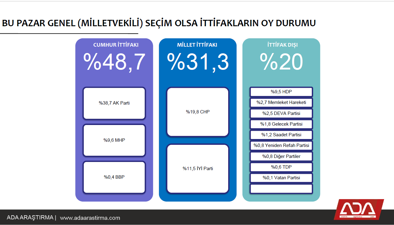 Araştırmayı… Cuma günü akşam saatlerinde tamamlayan ADA Araştırma Yöneticisi Ayhan Adıgüzel siyasi bölümde, bugüne kadar yayınlanan araştırmalardan daha çarpıcı bir sonuç bulmuş.