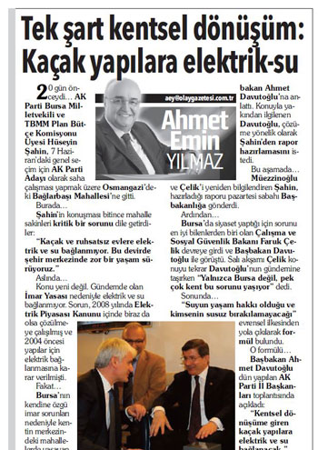 TBMM Plan Bütçe Komisyonu’nda kabul edilen Torba Yasa içinde yer alan ve AK Parti’nin de seçim vaatleri arasında olan “2004 sonrası yapılmış kaçak yapılara kentsel dönüşüm şartıyla elektrik, su ve doğalgaz bağlanmasına” olanak sağlayan yasa tasarısı en çok Yıldırım Belediye Başkanı İsmail Hakkı Edebali’yi mutlu etti.