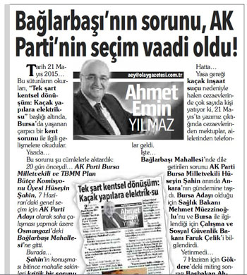7 Haziran seçimi çalışması için Bağlarbaşı Mahallesi’ne giden AK Parti Bursa Milletvekili Hüseyin Şahin konuşmasını yaptıktan sonra mahalle sakinlerinin isteğini bu sütunlardan duyurduk: